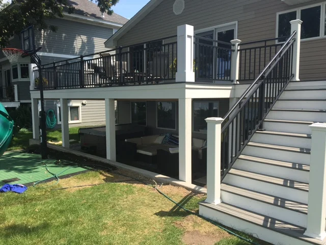 Trex decking with Westbury Aluminum railing with water drainage system for a finished ceiling in the future